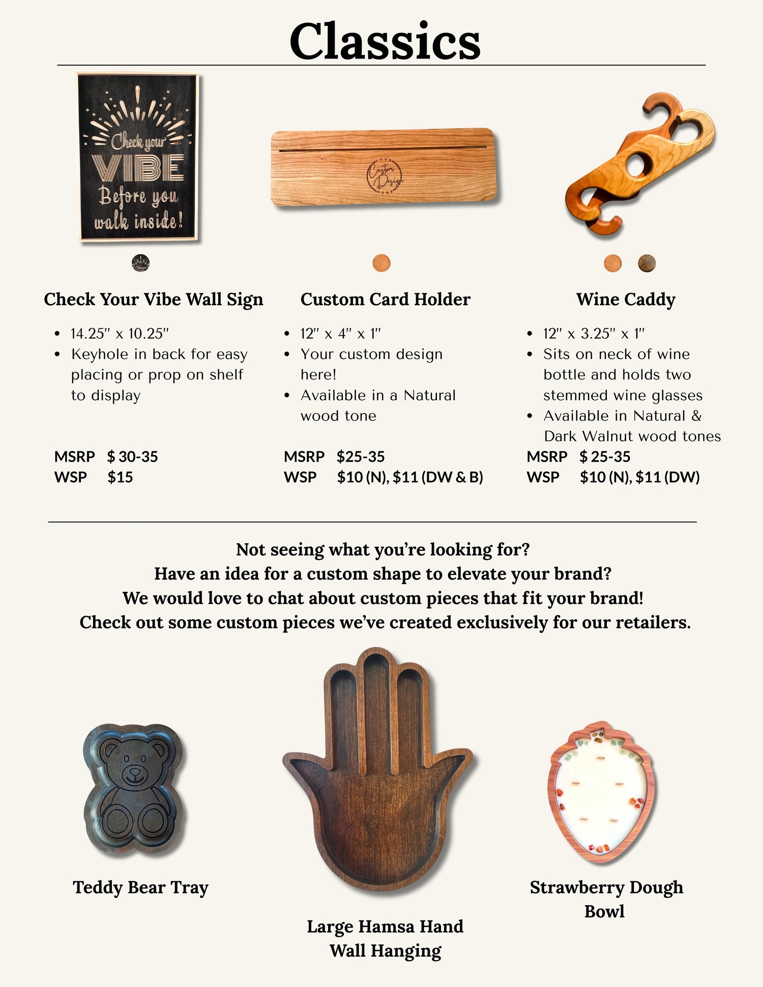 From wine caddies to custom card holders, these timeless designs fit effortlessly into any shop. Whether you want functional gifts or branded pieces with your logo, this collection covers it all.