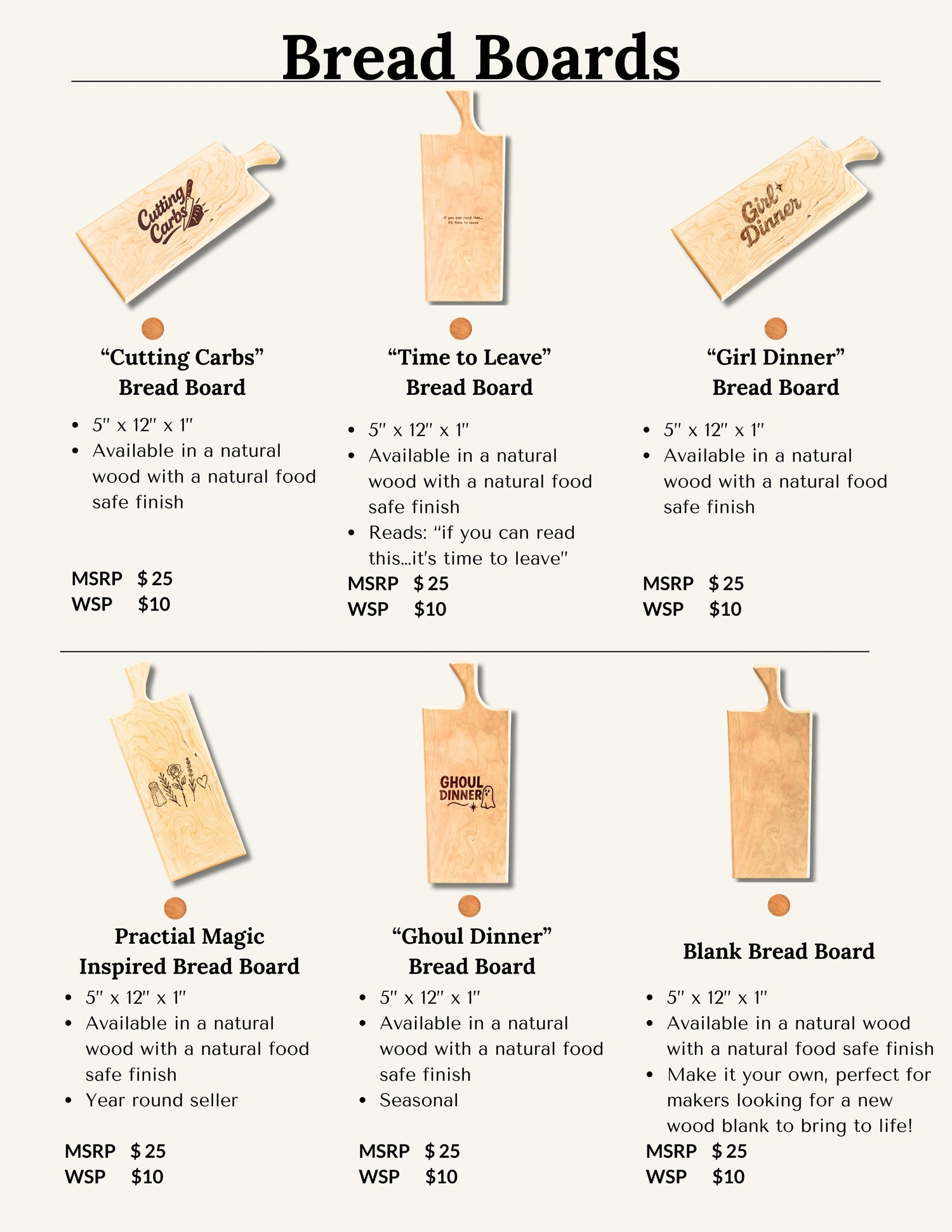 Our bread boards bring personality to the table. With witty engravings and trend driven designs, they are a playful way to stand out in your shop. Lightweight yet sturdy, they are perfect for kitchens, gifts, or even as countertop decor.